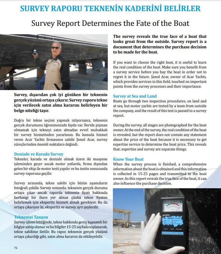 Sörvey (tekne muayenesi) bittiğinde ,yelkenli veya motoryat hakkında ,fotoğrafları ile birlikte, çok kapsamlı bir rapor hazırlarız.Satın almak istediğiniz teknenin durumu ile ilgili ciddi bir fikriniz olur. Tekneyle ilgili hazırlanan kapsamlı sörvey raporundan edindiğiniz bilgiler, sizin satın alma konusundaki kararınızı etkiler. Sörvey raporunda tekne alımından sonra yaptıracağınız bakımlar, onarımlar ,varsa masraflar ile ilgili detaylı bilgi sahibi olursunuz.